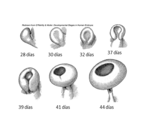 Como ya lo mencionamos, el ojo inicia su desarrollo al principio de la cuarta semana posterior a la concepción, siendo el período crítico el que transcurre entre los 28 y 44 días posteriores a la concepción.
