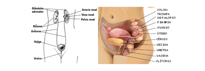 La orina se produce en los dos riñones y se transporta hacia la vejiga mediante dos conductos llamados uréteres. La vejiga vacía la orina a través de otro conducto llamado uretra. En las mujeres, la uretra es un conducto muy corto que termina inmediatamente delante de la vagina.