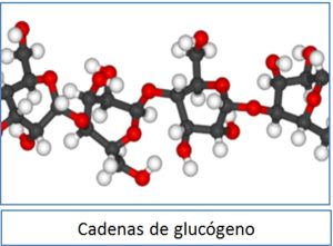 Es un material complejo formado de moléculas de glucosa unidas entre sí en forma de cadenas largas con muchas ramas (como un árbol). El glucógeno se almacena principalmente en el hígado y en las células de los músculos, pero también se almacena en los riñones, intestinos y cerebro.