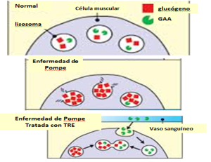 Esta enzima realiza su actividad dentro de los lisosomas celulares, que son estructuras que sirven como centro de reciclado dentro de la célula. Es por eso que se considera también como una enfermedad de almacenamiento lisosomal. En la enfermedad de Pompe, las mutaciones en el gen GAA, reducen o eliminan completamente la producción de la enzima GAA.