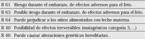 Estos factores son los más fáciles de identificar dado que en el envasado y etiquetado de todos los productos químicos aparecen una serie de códigos y letras que previenen de los riesgos intrínsecos a su manipulación. En el caso de riesgo para el embarazo tenemos las siguientes cuatro codificaciones: