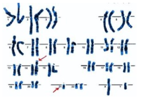 - Translocación equilibrada de cromosomas en uno de los padres. Por ejemplo, si un cromosoma 21 se encuentra pegado al 14, hay una probabilidad del 50% de que este progenitor transfiera esta translocación 14 / 21 a su descendencia. Este incremento de riesgo que va asociado con la translocación equilibrada de cromosomas depende del tipo de translocación, a qué cromosomas afecta, y si el portador es el padre o la madre. Generalmente, el riesgo de que un portador de traslocación tenga un hijo con síndrome de Down oscila entre el 2 y el 100%. Por ejemplo, si un progenitor tiene una translocación 21/21 y el embarazo continúa hasta el final, la probabilidad de que el hijo tenga síndrome de Down es del 100%. Si la translocación en la madre es 14/21, la probabilidad es del 8-10%. Si el portador de esta translocación es el padre, el riesgo es algo menor.