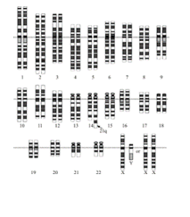 - Translocación equilibrada de cromosomas en uno de los padres. Por ejemplo, si un cromosoma 21 se encuentra pegado al 14, hay una probabilidad del 50% de que este progenitor transfiera esta translocación 14 / 21 a su descendencia. Este incremento de riesgo que va asociado con la translocación equilibrada de cromosomas depende del tipo de translocación, a qué cromosomas afecta, y si el portador es el padre o la madre. Generalmente, el riesgo de que un portador de traslocación tenga un hijo con síndrome de Down oscila entre el 2 y el 100%. Por ejemplo, si un progenitor tiene una translocación 21/21 y el embarazo continúa hasta el final, la probabilidad de que el hijo tenga síndrome de Down es del 100%. Si la translocación en la madre es 14/21, la probabilidad es del 8-10%. Si el portador de esta translocación es el padre, el riesgo es algo menor.